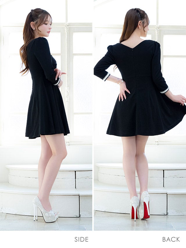 キャバドレス 韓国 ミニ丈 大きいサイズ フレア Aライン ワンピース 袖あり 七分袖 黒