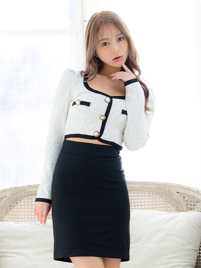 5. [韓国ドレス] ミニドレス タイト 長袖 ゴールドボタン ウエストカット ストレッチ ツイード調 パイピング モノトーン 白 黒 キャバドレス (uka着用) [tk-mdk8063]