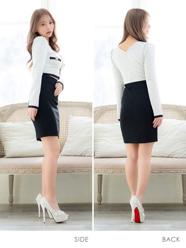 ミニドレス タイト 長袖 ゴールドボタン ウエストカット ストレッチ ツイード調 パイピング モノトーン 白 黒 キャバドレスのカラーバリエーション