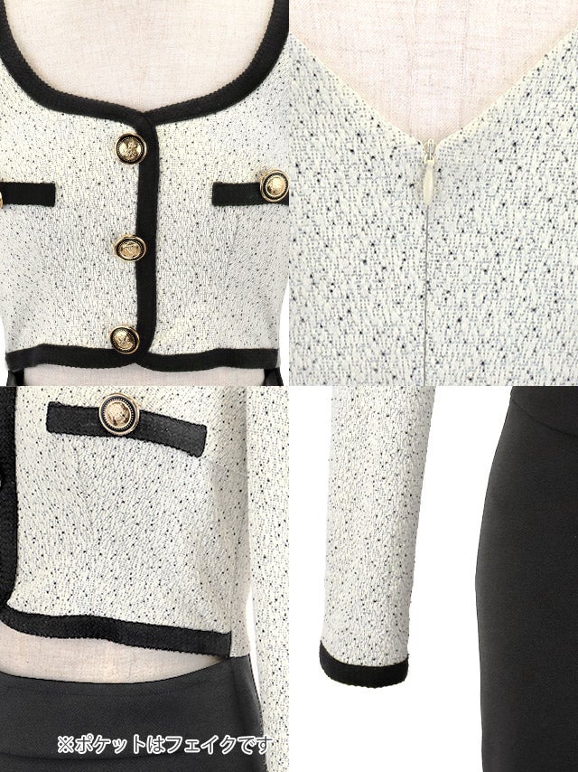 ミニドレス タイト 長袖 ゴールドボタン ウエストカット ストレッチ ツイード調 パイピング モノトーン 白 黒 キャバドレスのディティール1 ミニドレス タイト 長袖 ゴールドボタン ウエストカット ストレッチ ツイード調 パイピング モノトーン 白 黒 キャバドレスのディティール2
