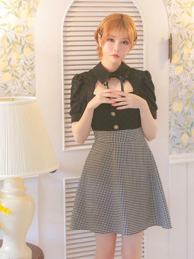 4. [SALE] [韓国ドレス] ミニドレス ネックリボン 襟付き 半袖 パフスリーブ バストカット ギンガムチェック柄 谷間魅せ Aライン キャバドレス (戦慄かなの着用) [tk-mdk916-wa]