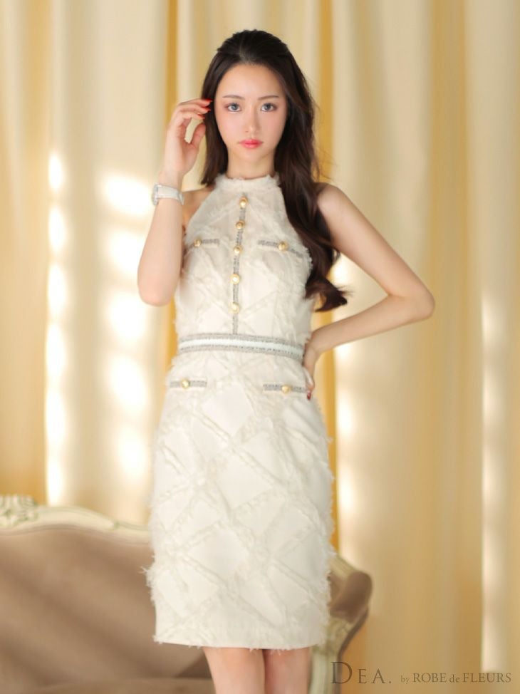 キャバドレス 同伴ドレス DEA.byROBEdeFLEURS ディアバイローブドフルール 高級アメリカンスリーブフリンジゴールドボタン切り替え膝丈ドレス