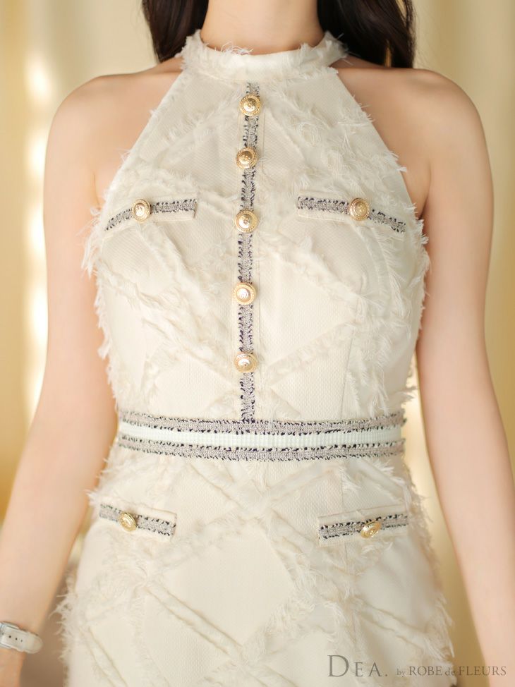 5. [DEA.byROBEdeFLEURS/ディアバイローブドフルール] 高級ノースリーブフリンジゴールドボタン切り替え膝丈ドレス