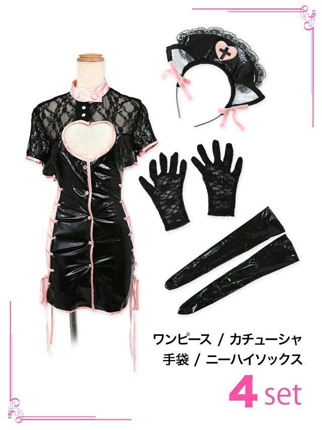 4. [コスプレ] ハートカットセクシーツイン猫ナースアニマル [4点セット] (ワンピース/カチューシャ/手袋/ニーハイソックス)