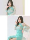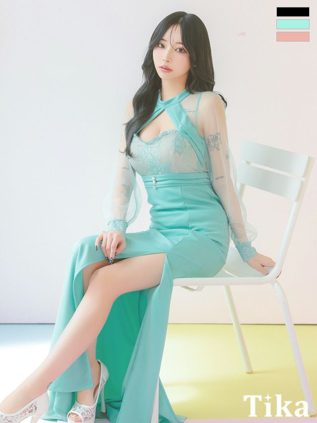 長袖シアーバストカットレース切り替えサイドスリットストレッチタイトロングドレスのカラーバリエーション
