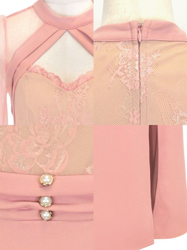 長袖シアーバストカットレース切り替えサイドスリットストレッチタイトロングドレスの商品詳細1