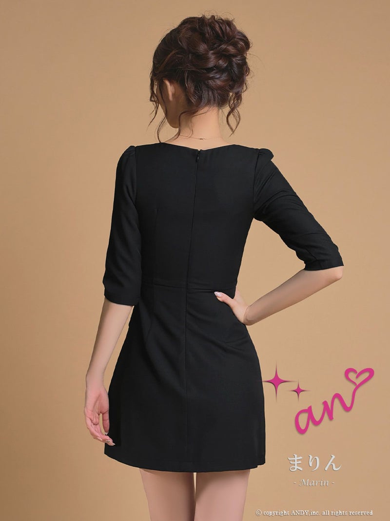 キャバドレス an アン 高級 ブランド ワンピース Aラインミニドレス シンプル 袖あり 五部袖 ウエストベルト ジップ ブラジャーのまま スクエアネック プリーツ