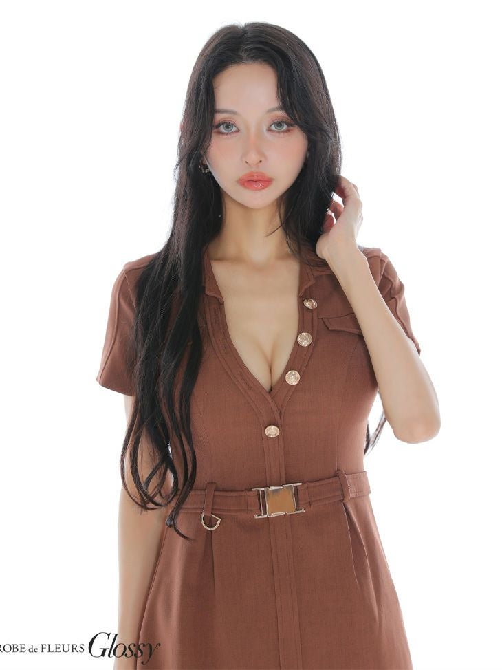 4. [ROBEdeFLEURSGlossy/ローブドフルールグロッシー] 高級 ブランド ワンピース タイトミニドレス 谷間 シンプル 半袖 ウエストベルト 襟付き ブラジャーのまま 同伴 Vネック ボタン