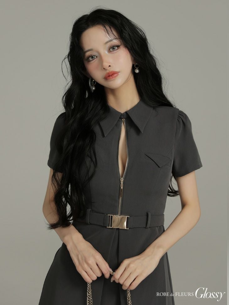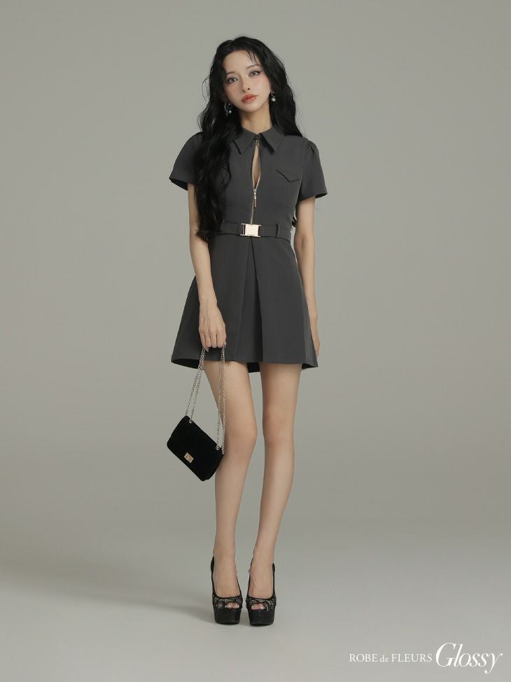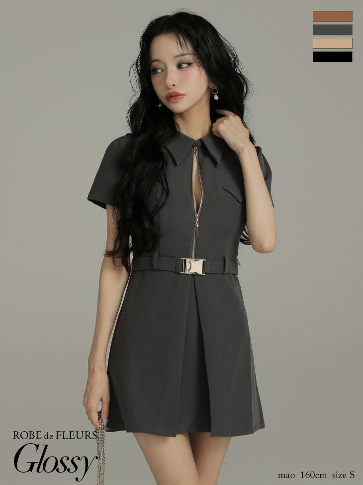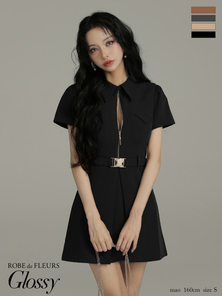 4. 予約商品【4月中旬入荷予定】[ROBEdeFLEURSGlossy/ローブドフルールグロッシー] 高級 ブランド Aラインミニドレス 谷間 半袖 ウエストベルト 襟付き ジップ