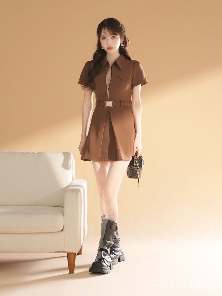 6. 予約商品【4月中旬入荷予定】[ROBEdeFLEURSGlossy/ローブドフルールグロッシー] 高級 ブランド Aラインミニドレス 谷間 半袖 ウエストベルト 襟付き ジップ