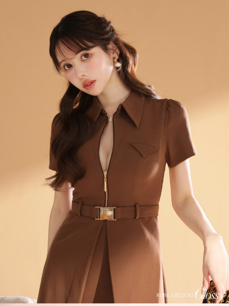 5. 予約商品【4月中旬入荷予定】[ROBEdeFLEURSGlossy/ローブドフルールグロッシー] 高級 ブランド Aラインミニドレス 谷間 半袖 ウエストベルト 襟付き ジップ