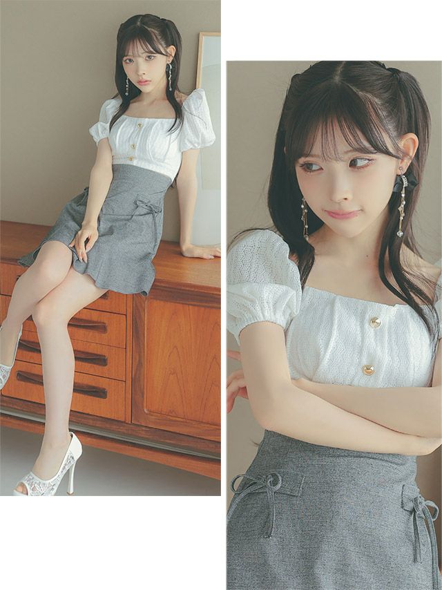 ウエストちら魅せにきゅん♪ [韓国ドレス] 半袖パフスリーブウエストカットリボンスカートフレアミニドレス (Sサイズ~Lサイズ) (緩苺/キャバドレス着用)