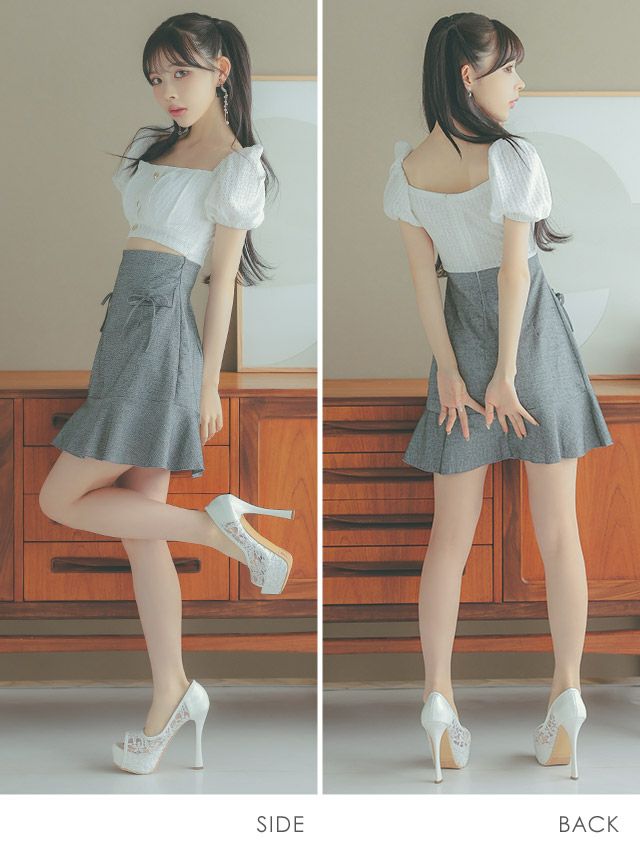 4. [韓国ドレス] 半袖パフスリーブウエストカットリボンスカートフレアミニドレス (Sサイズ~Lサイズ) (緩苺/キャバドレス着用)