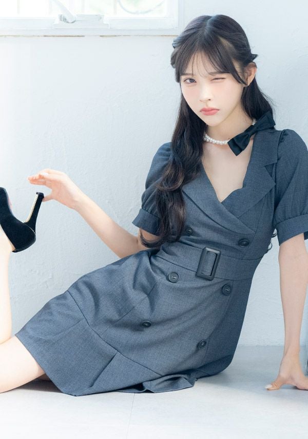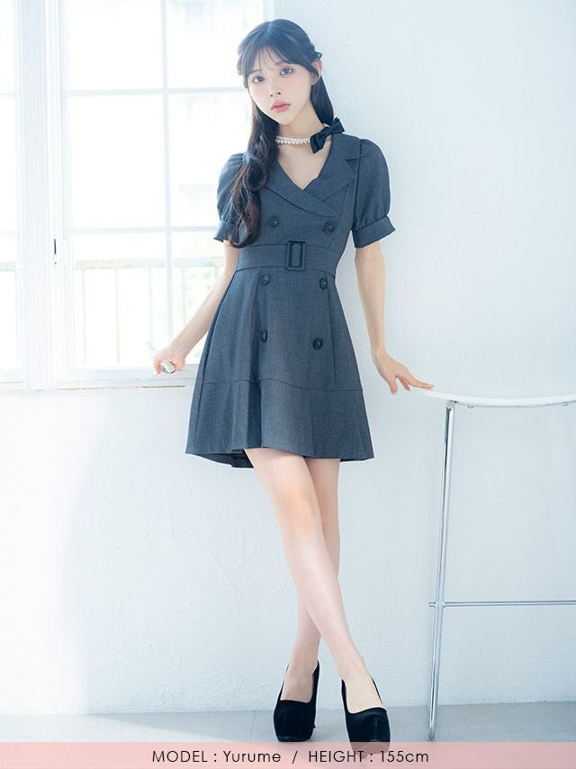 ウエストマークでメリハリ美ボディへ◎ [韓国ドレス] ミニドレス 襟付き ウエストベルト 半袖 パフスリーブ ワンピース グレー Aライン キャバドレス (緩苺着用) [tk-mdk133]