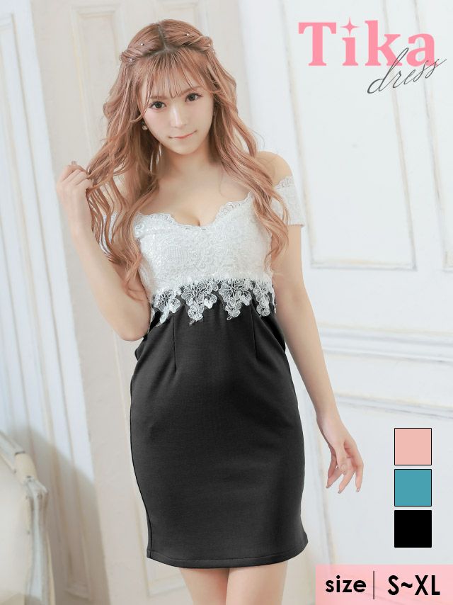 3. バイカラーホワイト刺繍レース切替オフショルダータイトミニドレス (Sサイズ~XLサイズ) (聖菜/キャバドレス着用)