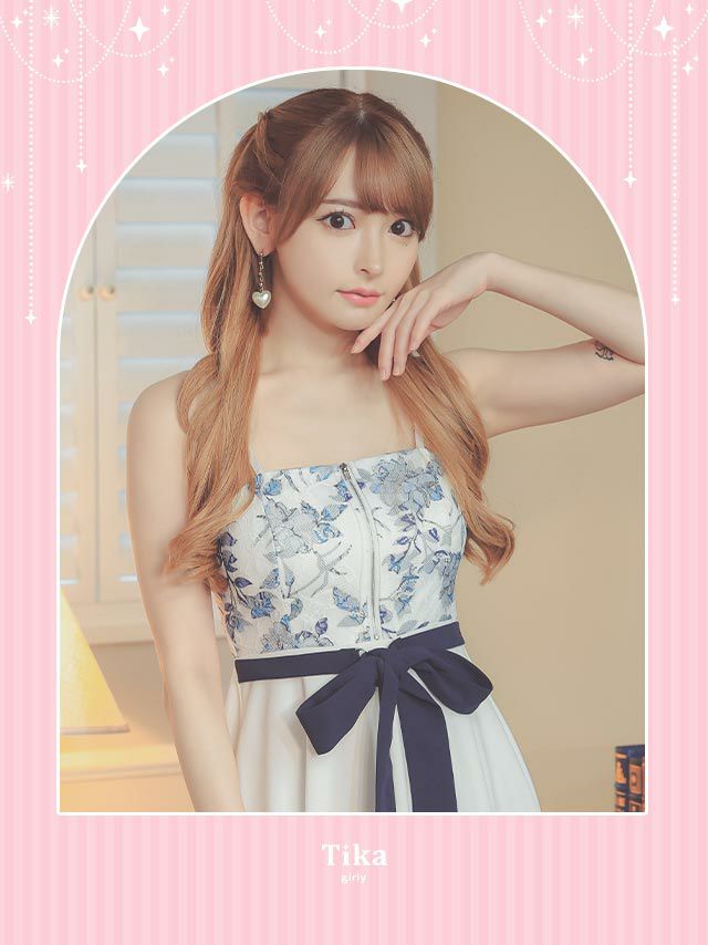 キャバドレス ミニ丈 Aライン 大きいサイズ Tika ティカ フロントジップフラワーレースキャミソール切り替えウエストベリボンフレアミニドレス