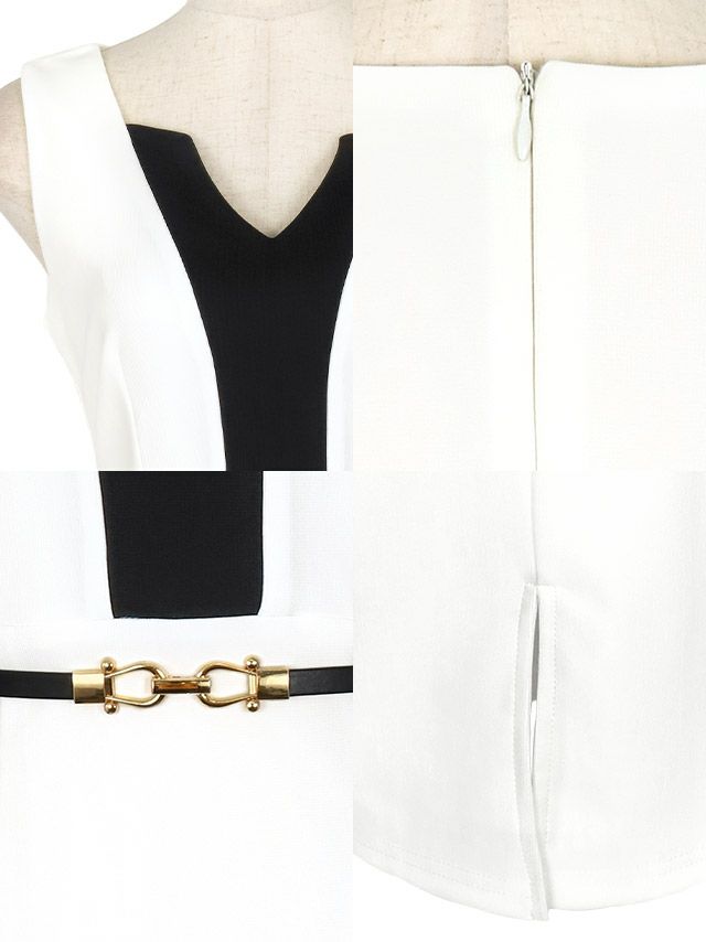 ノースリーブVカットネックウエストベルト付きバイカラータイトミニドレスの商品詳細画像1