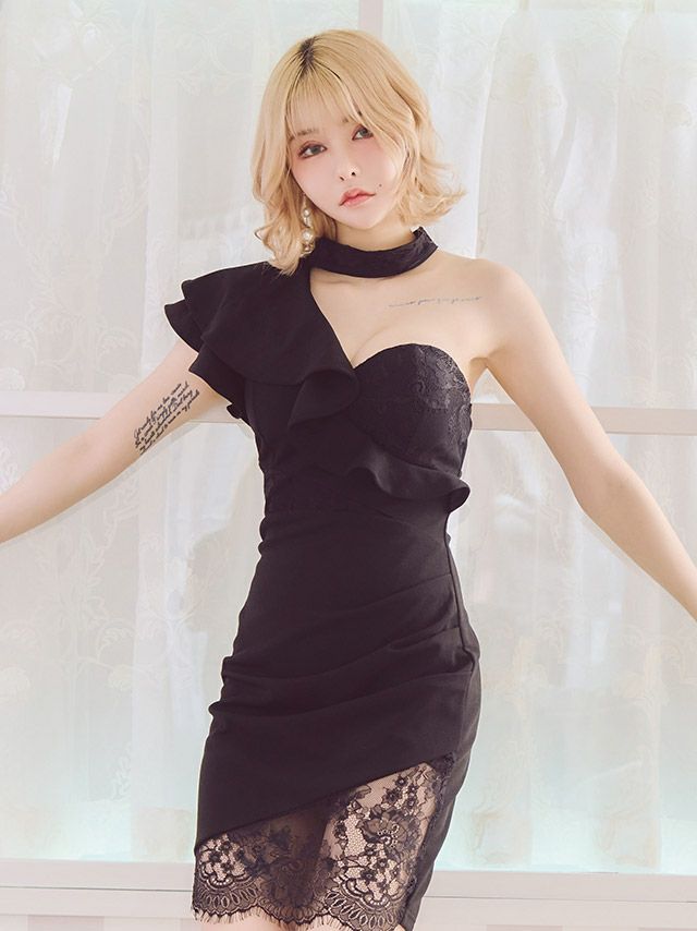 人気のデザイン詰め込みました♪ タイトミニドレス 谷間 シンプル レース ストレッチ ワンショルダー ワンカラー (戦慄かなの着用)