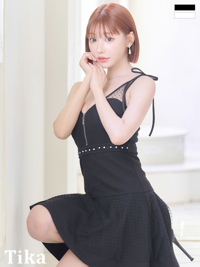 3. ショルダーリボンキャミソールバストジップウエストストーンドットチュールフレアミニドレス (Sサイズ~XLサイズ) (浦西ひかる/キャバドレス着用)