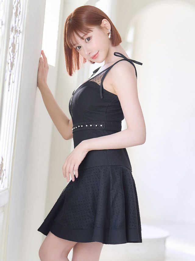 4. ショルダーリボンキャミソールバストジップウエストストーンドットチュールフレアミニドレス (Sサイズ~XLサイズ) (浦西ひかる/キャバドレス着用)