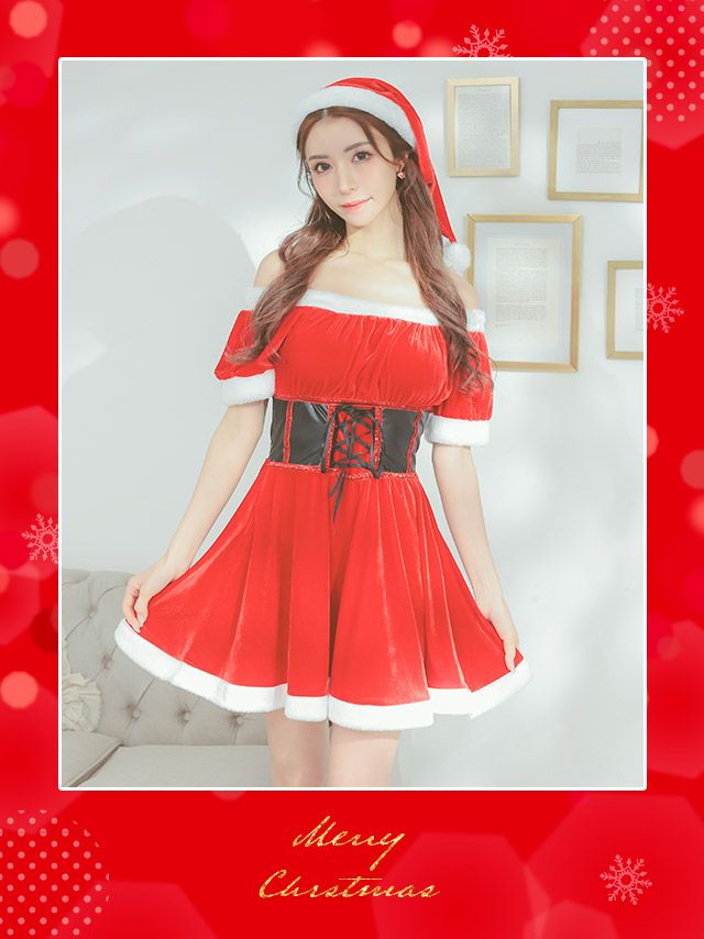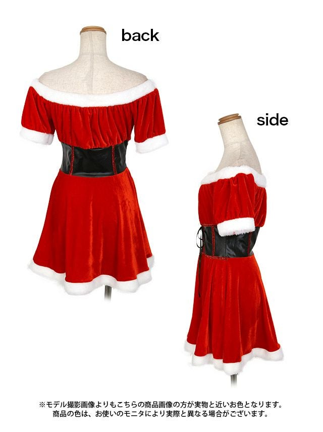 サンタコス 2点set 2WayオフショルウエストレースアップAラインベロアクリスマスガーリーサンタコスプレのブツどり画像