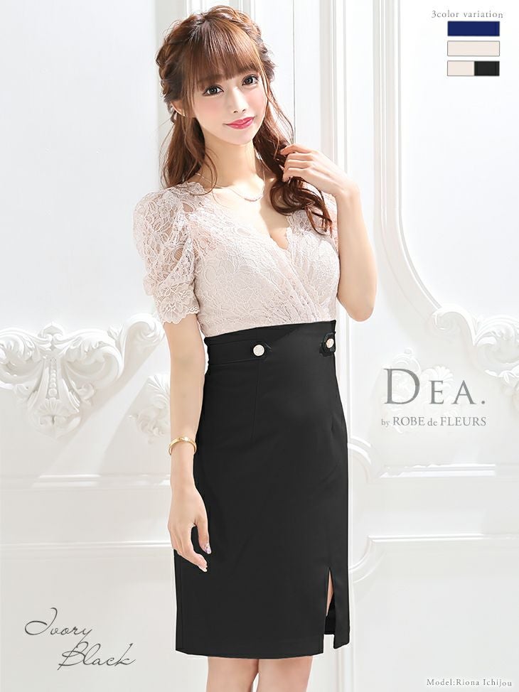 3. [DEA.byROBEdeFLEURS/ディアバイローブドフルール] 高級半袖フラワーレースハイウエスト切替膝丈タイトドレス