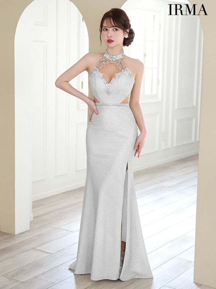 4. [IRMA/イルマ] 高級ホルターネックエレガントビジューくびれラメニットタイトロングドレス