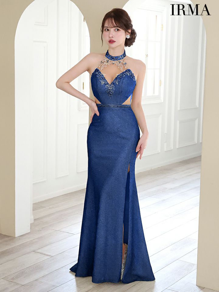 色気ある美ボディラインをアピール♪ [IRMA/イルマ] 高級ホルターネックエレガントビジューくびれラメニットタイトロングドレス