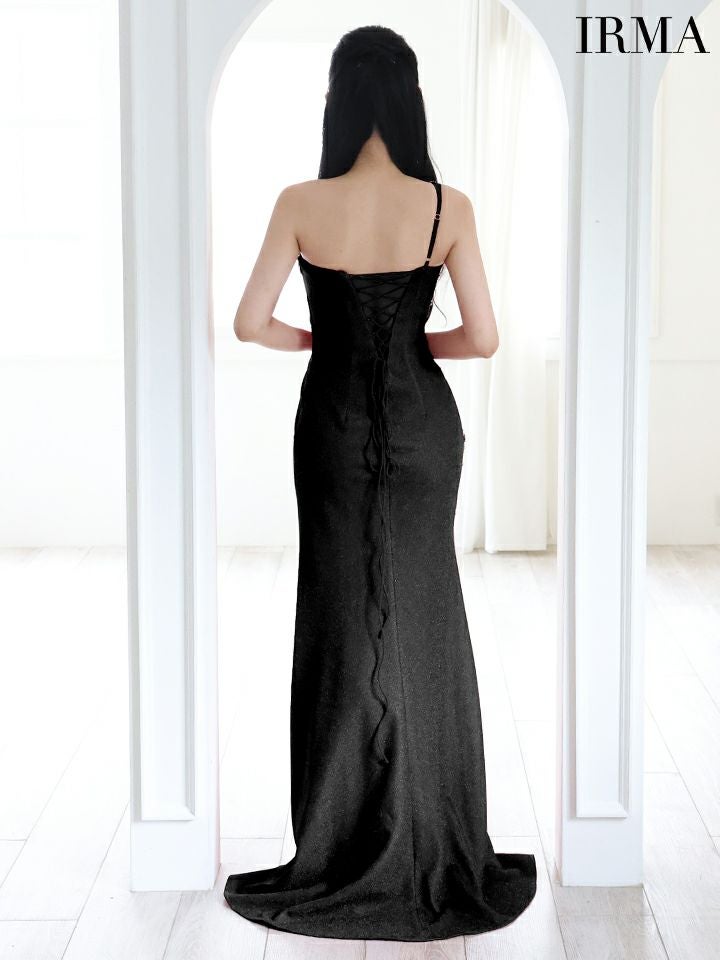 スリットから魅える素脚がsexy☆ [IRMA/イルマ] 高級ラメニットワンショルダー刺繍フラワービジュータイトロングドレス
