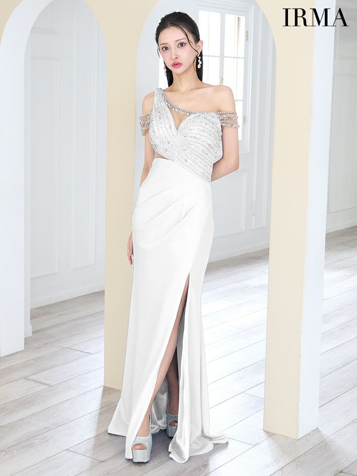 4. [IRMA/イルマ] 高級 バストシースルー ビジュー タック ワンショルダー 谷間魅せ タイトロングドレス