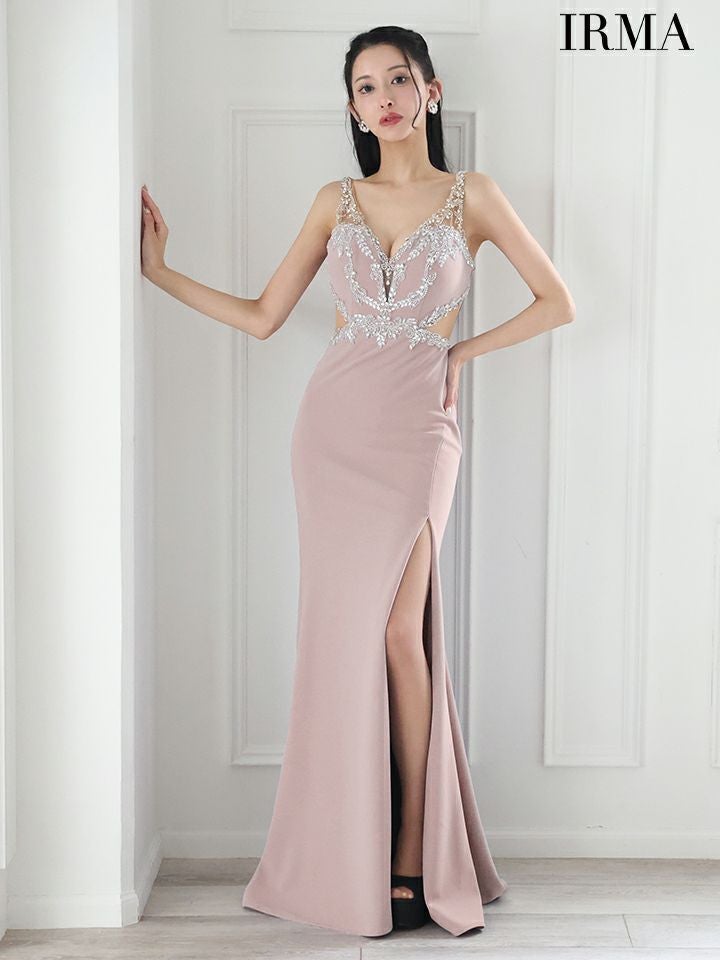 5. [IRMA/イルマ] 高級 ノースリーブ ニットジョーゼット くびれ ビジュー スリット タイトロングドレス