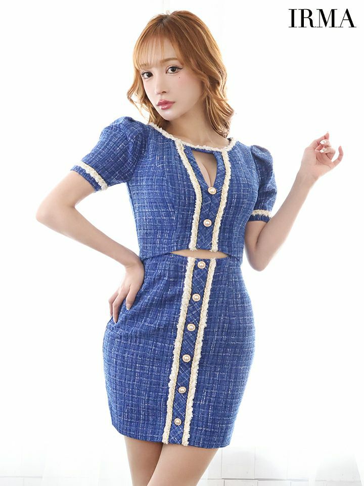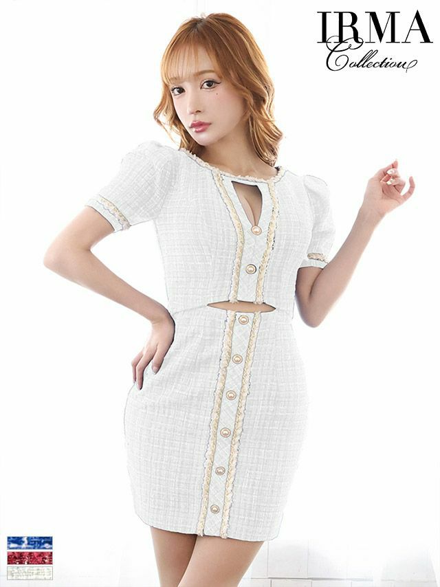 キャバドレス ミニドレス [IRMA/イルマ] 高級袖あり縁取りツイードボタンデザインカットアウトタイトミニドレス