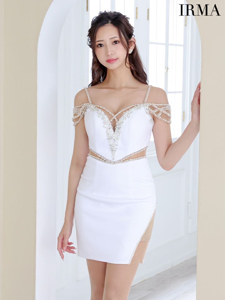 ビジューがゴージャスに煌めくドレス☆ SALE [IRMA/イルマ] 高級 ゴージャス フラワービジュー 肩出し 二の腕カバー くびれ バストコード 谷間魅せ タイトミニドレス