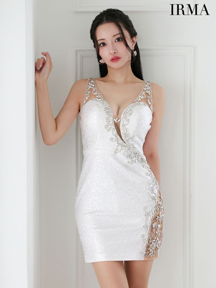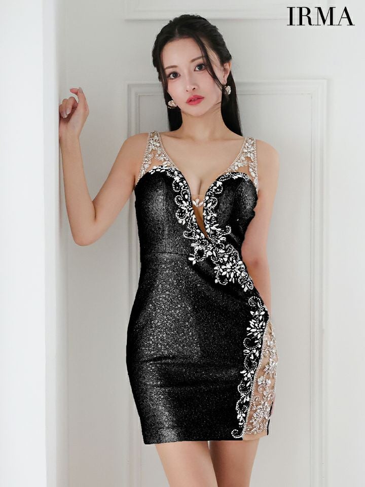 4. [IRMA/イルマ] 高級 ノースリーブ ワンカラー バストシースルー ビジュー 谷間魅せ タイトミニドレス