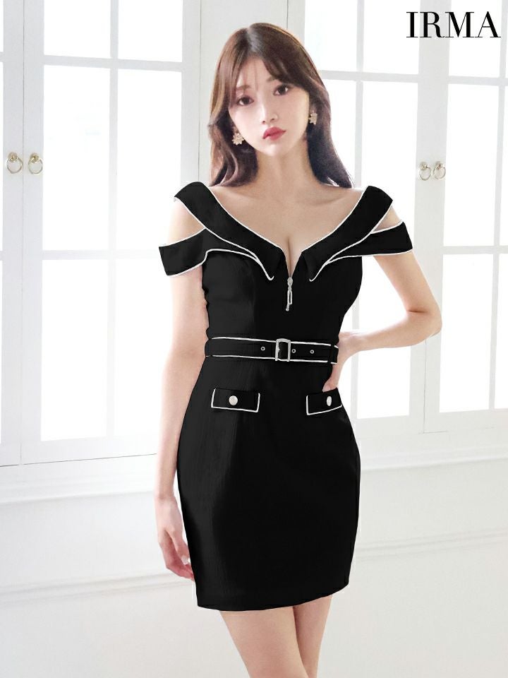 4. [IRMA/イルマ] 高級肩出し 二の腕カバージップウエストベルト柄織りニットシンプルタイトミニドレス