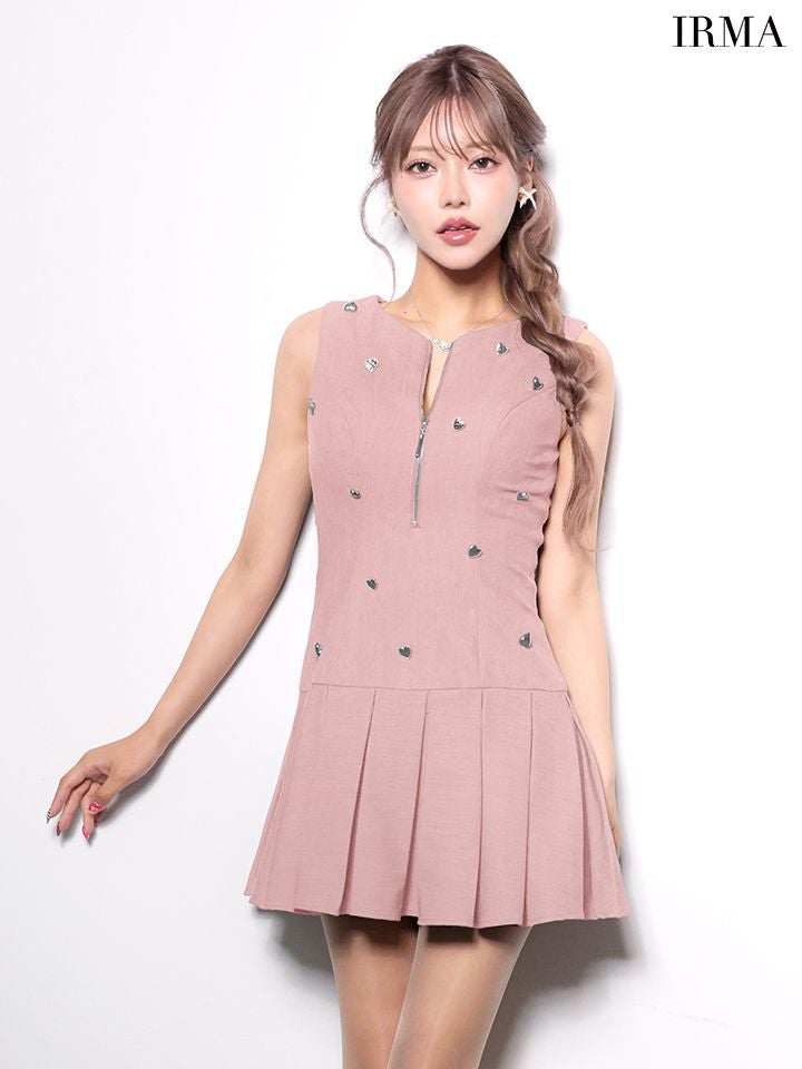 散りばめられたハートがCUTE♡ 予約商品【5月中旬入荷予定】[IRMA/イルマ] 高級 ブランド Aラインミニドレス 谷間 ノースリーブ ジップ ハートボタン プリーツ