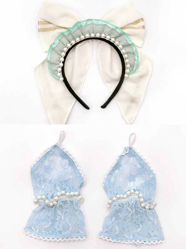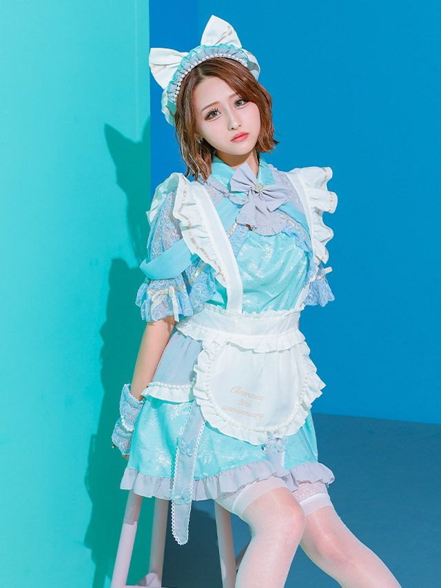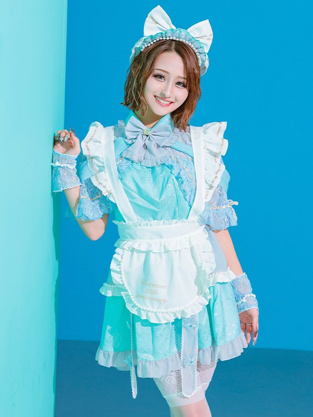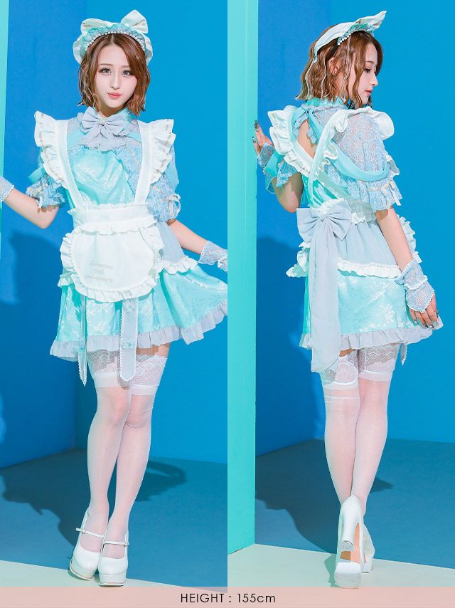 3. [SALE] コスプレ ラブリーフリフリリボンフレアスカート体型カバーガーリーメイド [6点セット] (ケープ/ワンピース/エプロン/カチューシャ/透明ストラップ/グローブ)