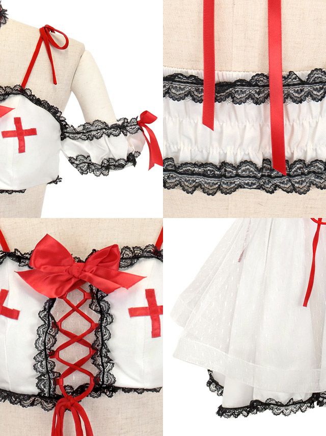 4. [SALE] コスプレ レースアップリボンフレアスカートへそ出しセパレートセクシーナース [4点セット] (トップス/スカート/カチューシャ/チョーカー)