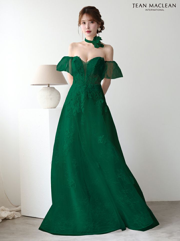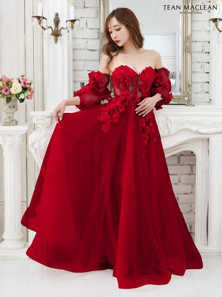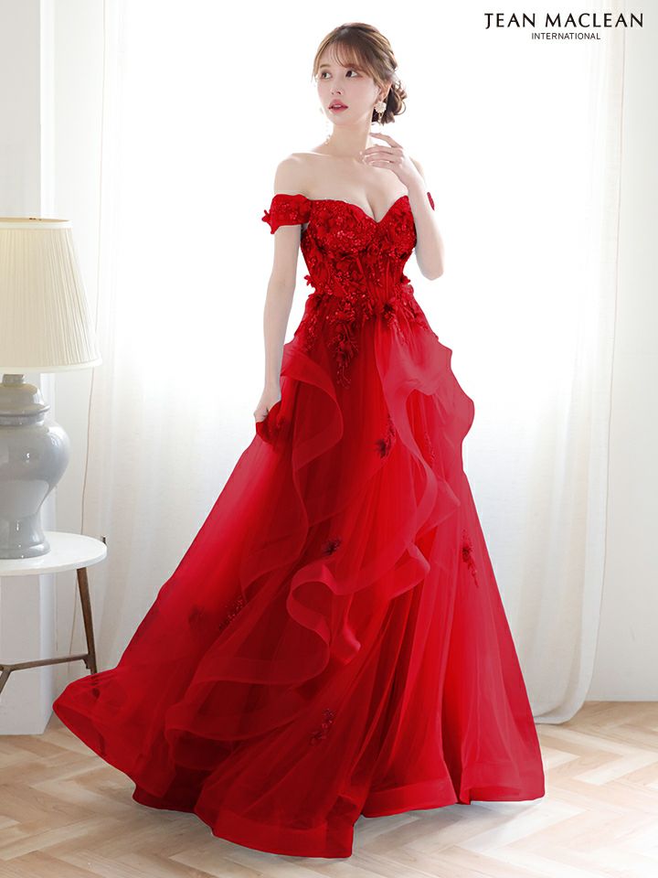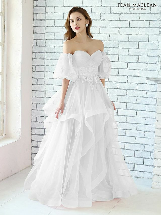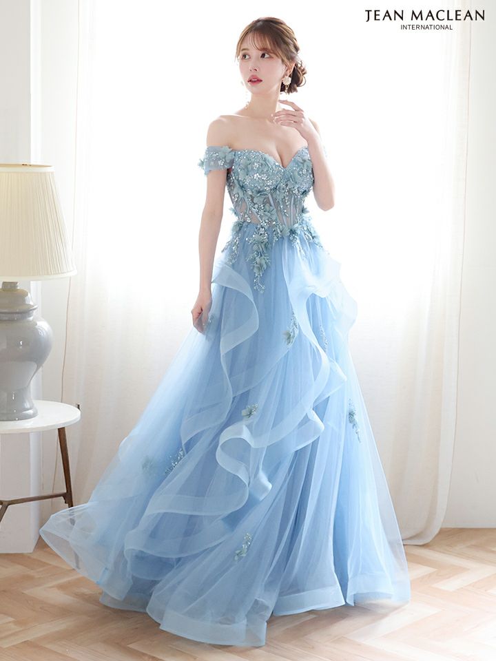 ティアードフリルで華やかに♡ 予約商品【4月下旬入荷予定】[JEANMACLEAN/ジャンマクレーン] 高級 ブランド バースデー Aラインロングドレス 谷間 パフスリーブ付き ベア 2way 3Dフラワー スパンコール ティアード フリル