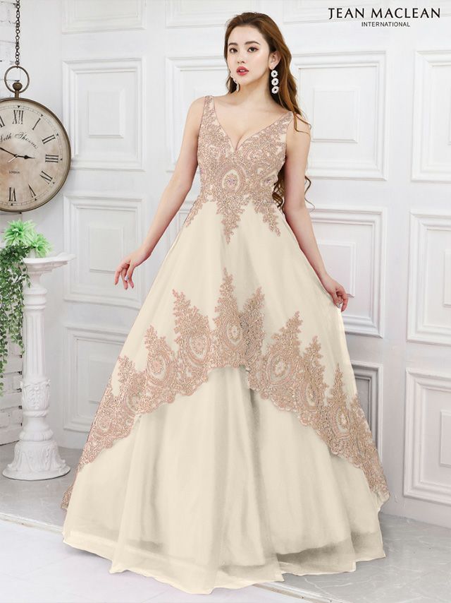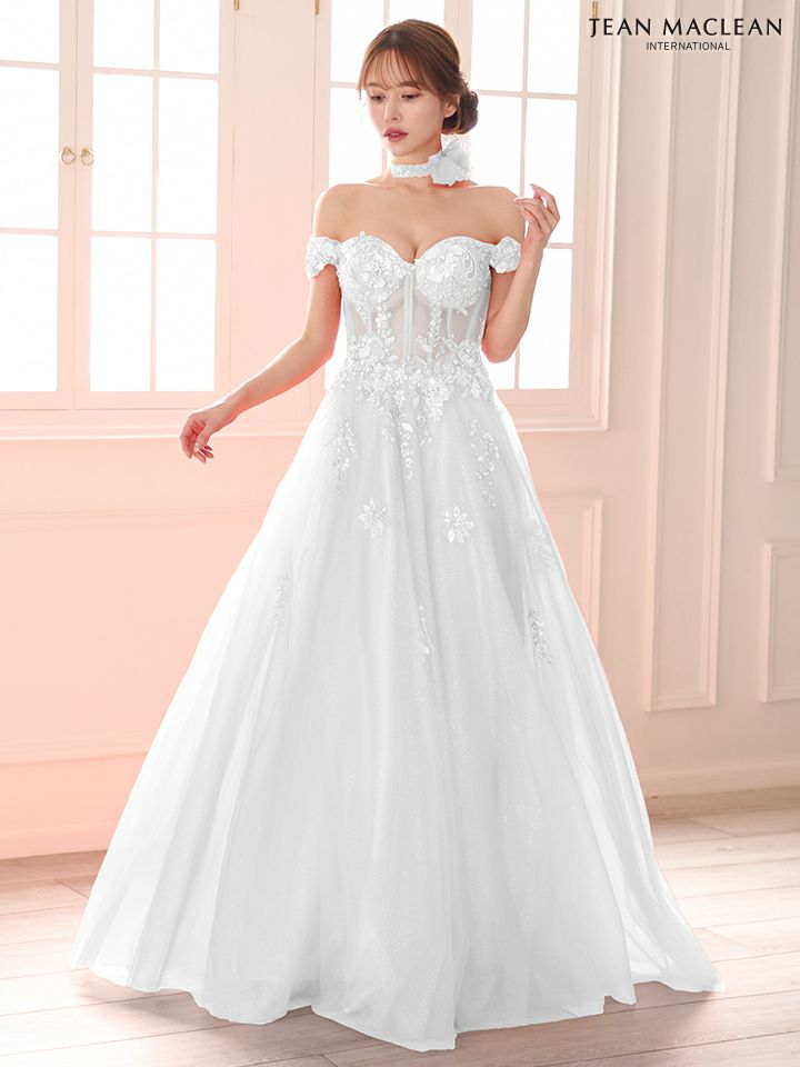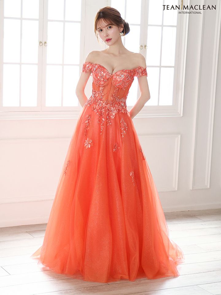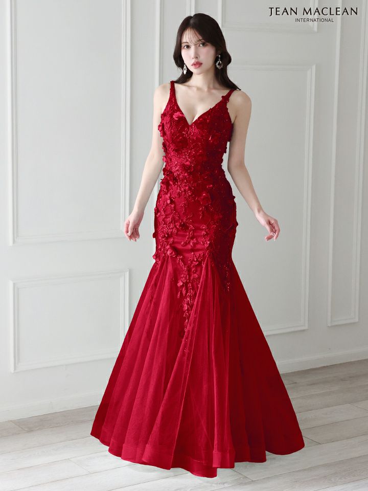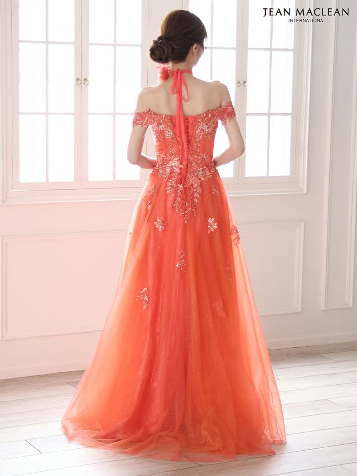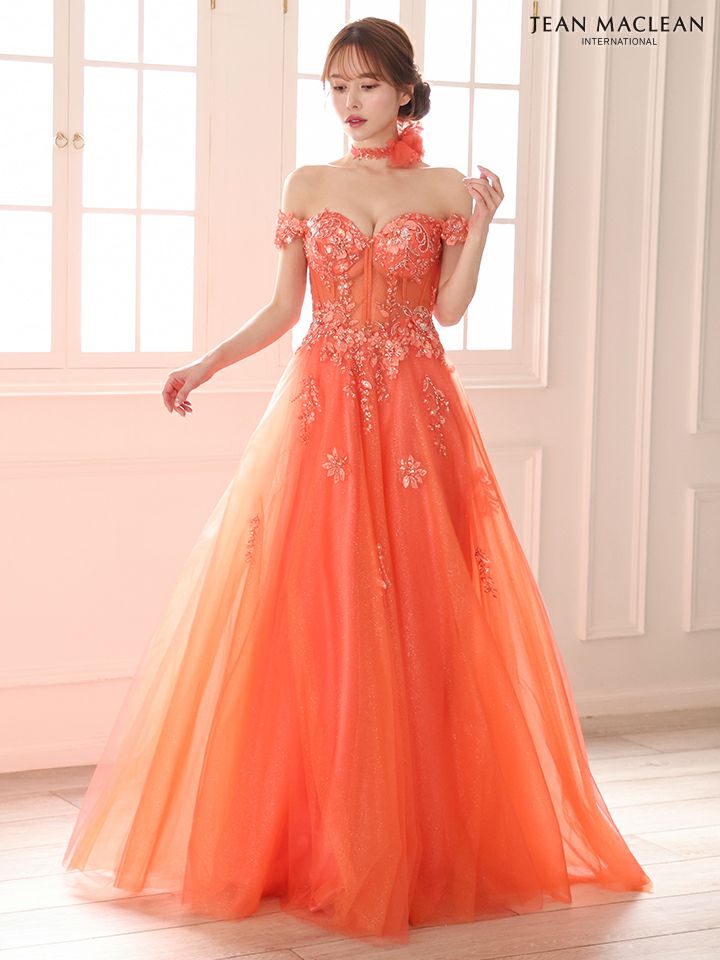 ティアードフリルで華やかに♡ 予約商品【4月下旬入荷予定】[JEANMACLEAN/ジャンマクレーン] 高級 ブランド バースデー Aラインロングドレス 谷間 パフスリーブ付き ベア 2way 3Dフラワー スパンコール ティアード フリル