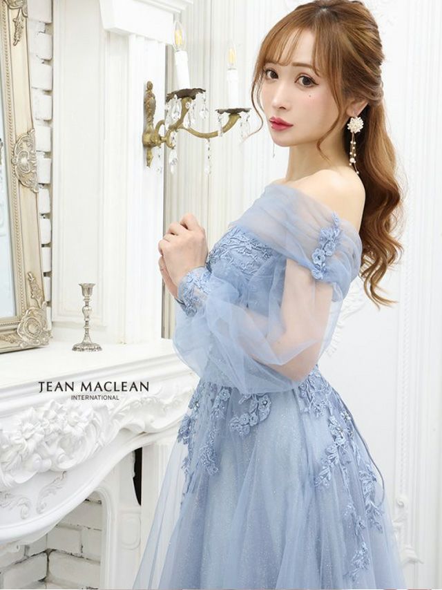 キャバドレス ブランド JEANMACLEAN ジャンマクレーン 高級パフスリーブ付きフラワーモチーフベアトップくびれ袖ありチュールフレアバースデーAラインロングドレス