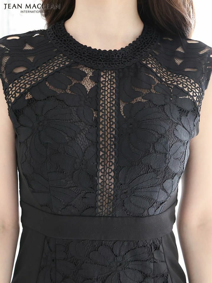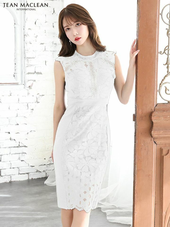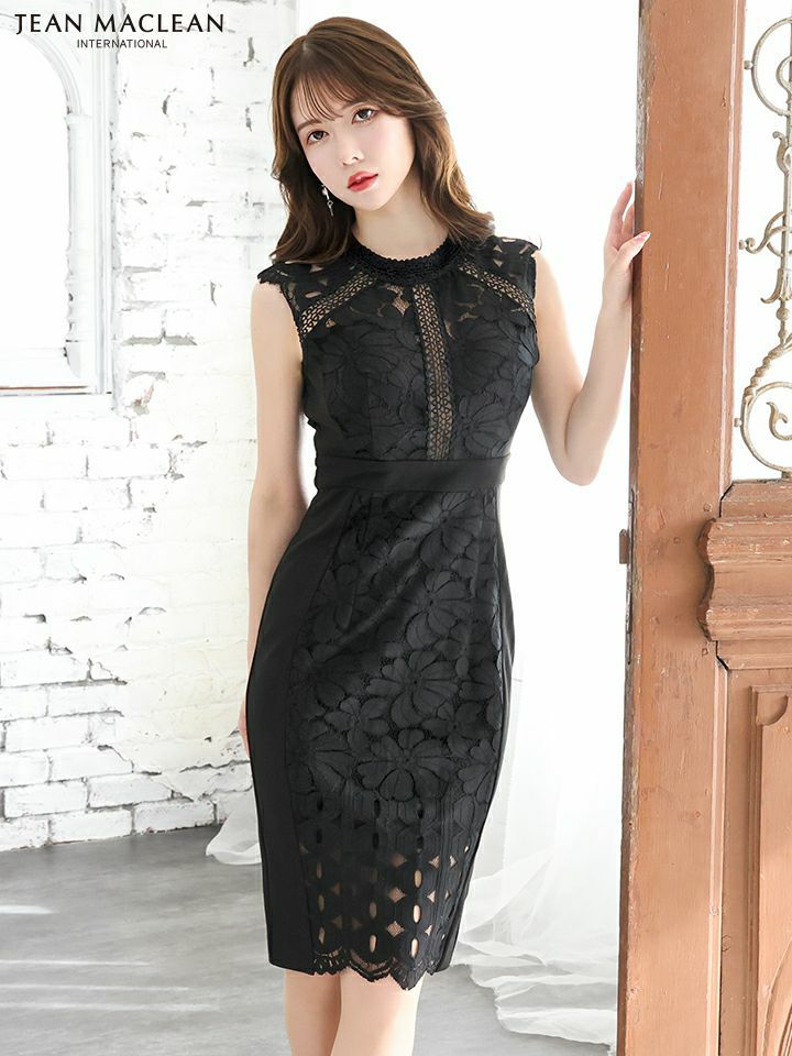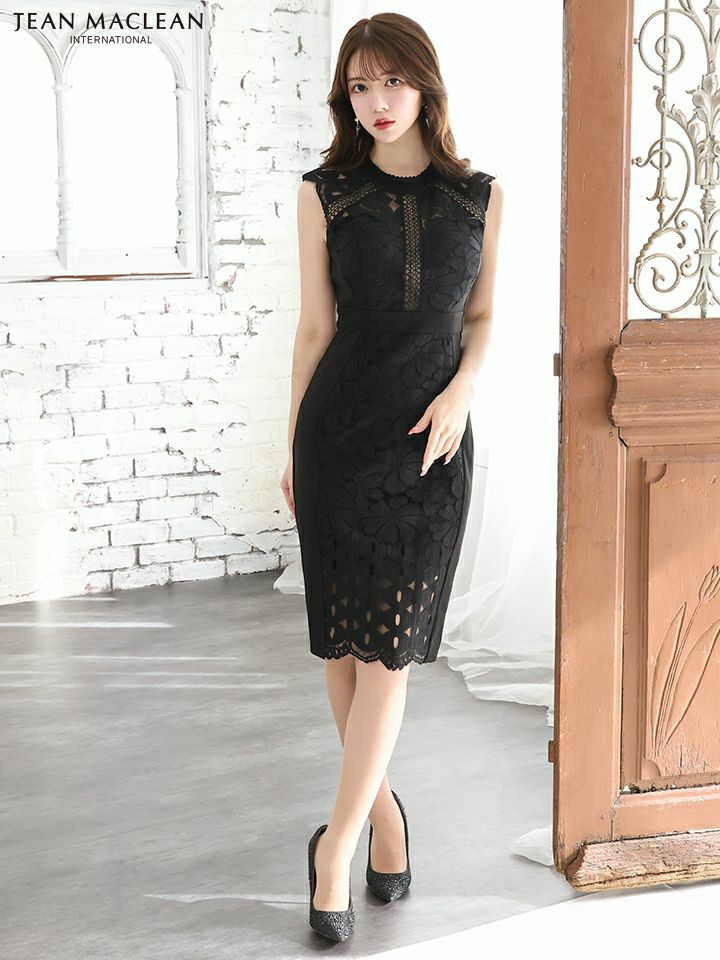 フラワーレースでフェミニンな印象に☆ SALE [JEANMACLEAN/ジャンマクレーン] 高級ワンカラーフラワーレース切替バックノースリーブタイト膝丈ドレス