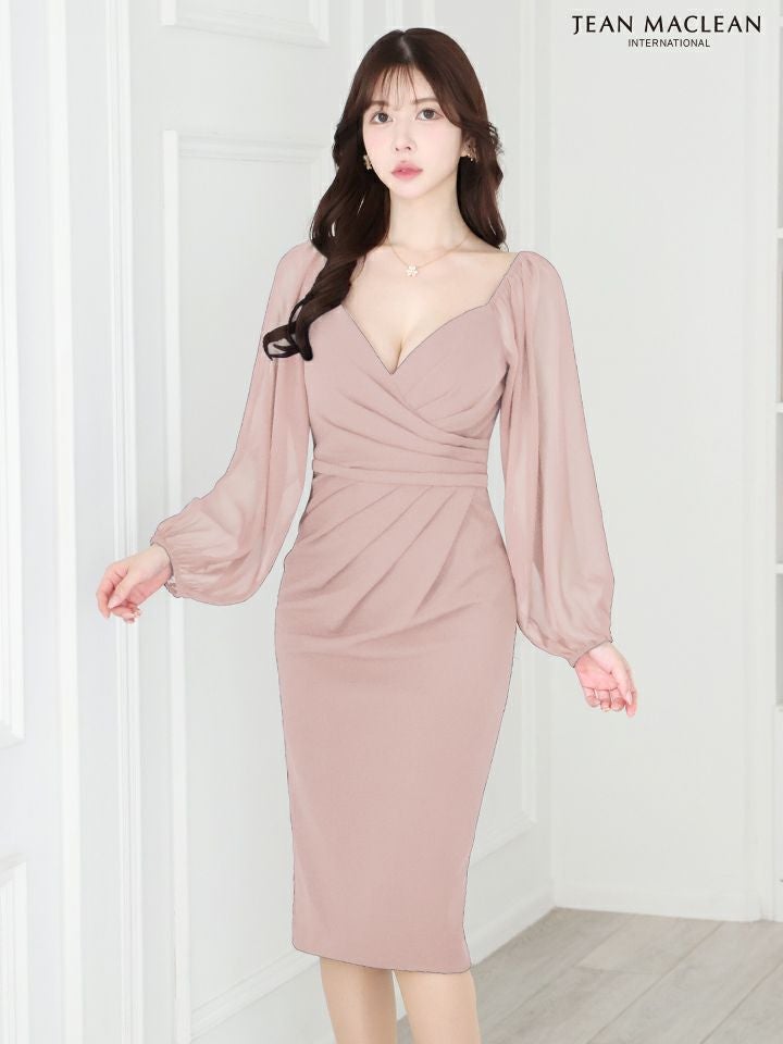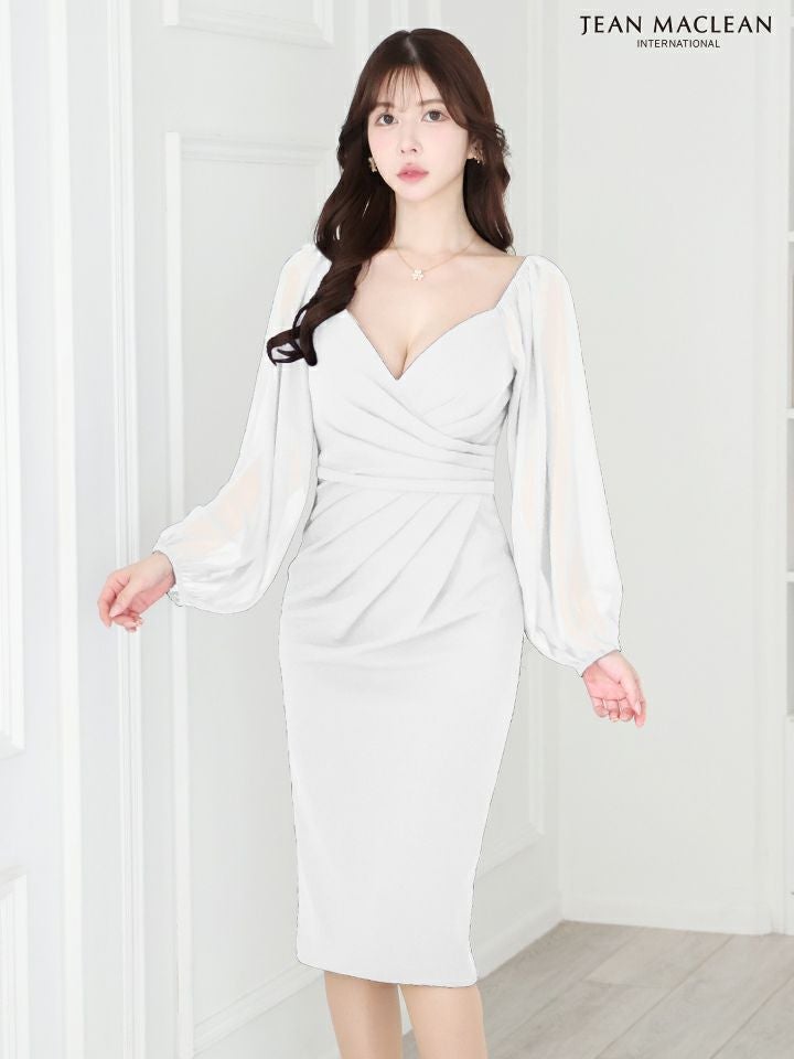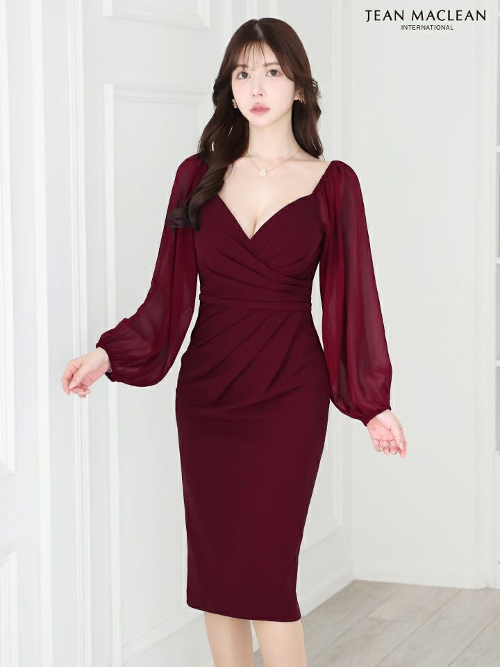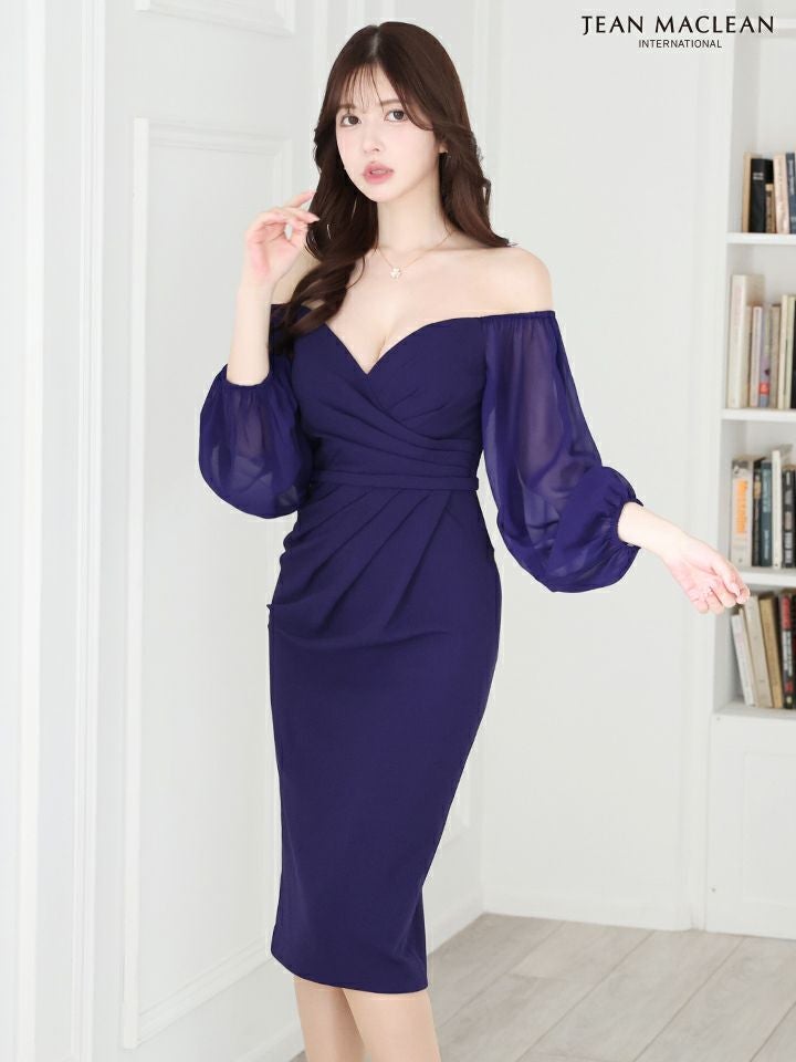 その日の気分で着こなしを楽しめる☆ [JEANMACLEAN/ジャンマクレーン] 高級オフショルダーウエストタック長袖 袖ありタイト膝丈ドレス