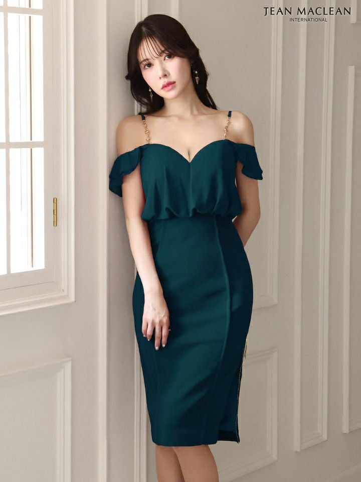 5. SALE [JEANMACLEAN/ジャンマクレーン] 高級 ワンカラー肩出し 二の腕カバー ジップ ファスナースリット タイト 膝丈ドレス