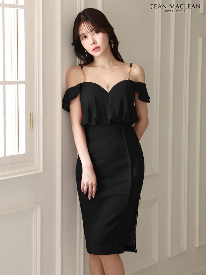4. SALE [JEANMACLEAN/ジャンマクレーン] 高級 ワンカラー肩出し 二の腕カバー ジップ ファスナースリット タイト 膝丈ドレス