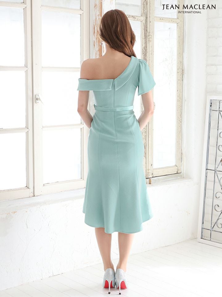 4. SALE [JEANMACLEAN/ジャンマクレーン] 高級ワンショルダーウエストベルトマーメイド半袖タイト膝丈ドレス