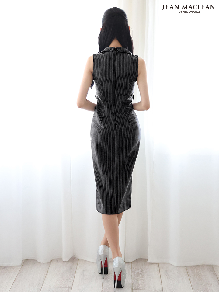 スタイリッシュな女性に♡ [JEANMACLEAN/ジャンマクレーン] 高級 襟付き ストライプ ジップ ノースリーブ 膝丈ドレス
