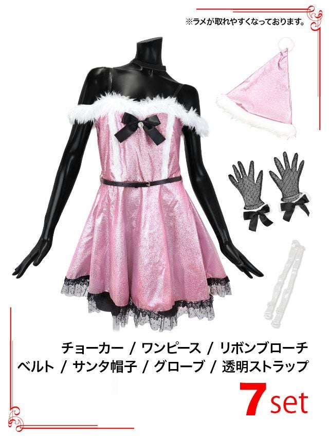 乙女心くすぐるキラキラピンクサンタ♪ サンタコスプレ 7点set ベルト付きふわふわオフショルリボングリッターピンクガーリーフレアスカート王道 [帽子+チョーカー+リボンブローチ+ワンピース+透明ストラップ+グローブ+ベルト]