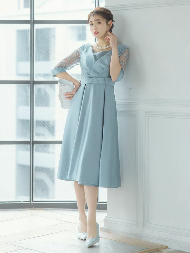 他の画像を見る 上品高見えフェミニンドレス♪ フラワー刺繍シースルー切替クロスデザイン五分袖ウエストリボン膝下結婚式パーティードレス [Retica/レティカ] ¥ 11,000 税込 お気に入りに追加
