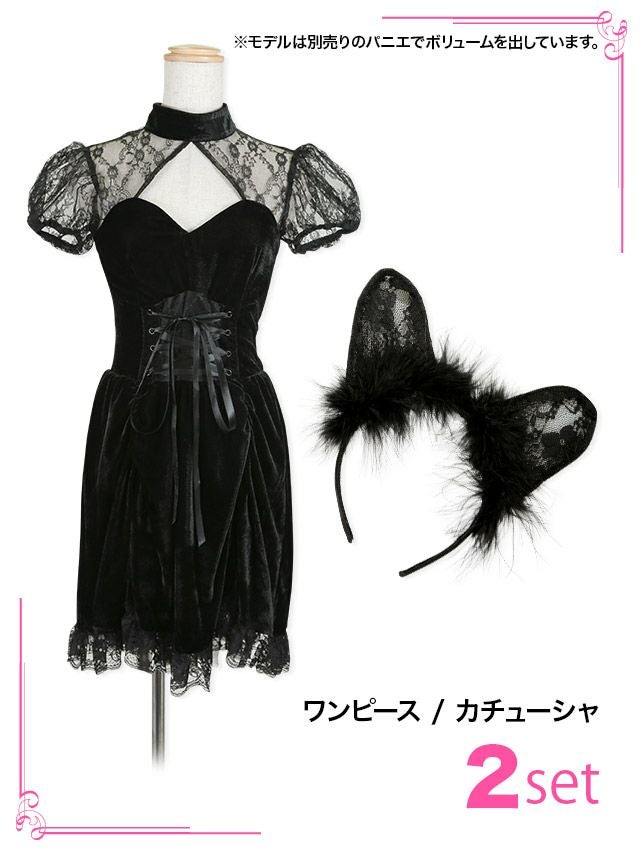 ダークな天使コスプレで周りと差をつける! [コスプレ] ダークブラックツイン袖あり体型カバーホラーエンジェル [3点セット] (ワンピース/カチューシャ/羽)